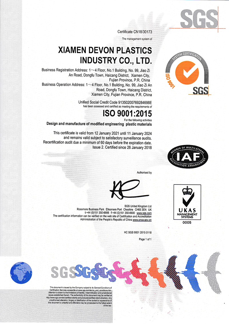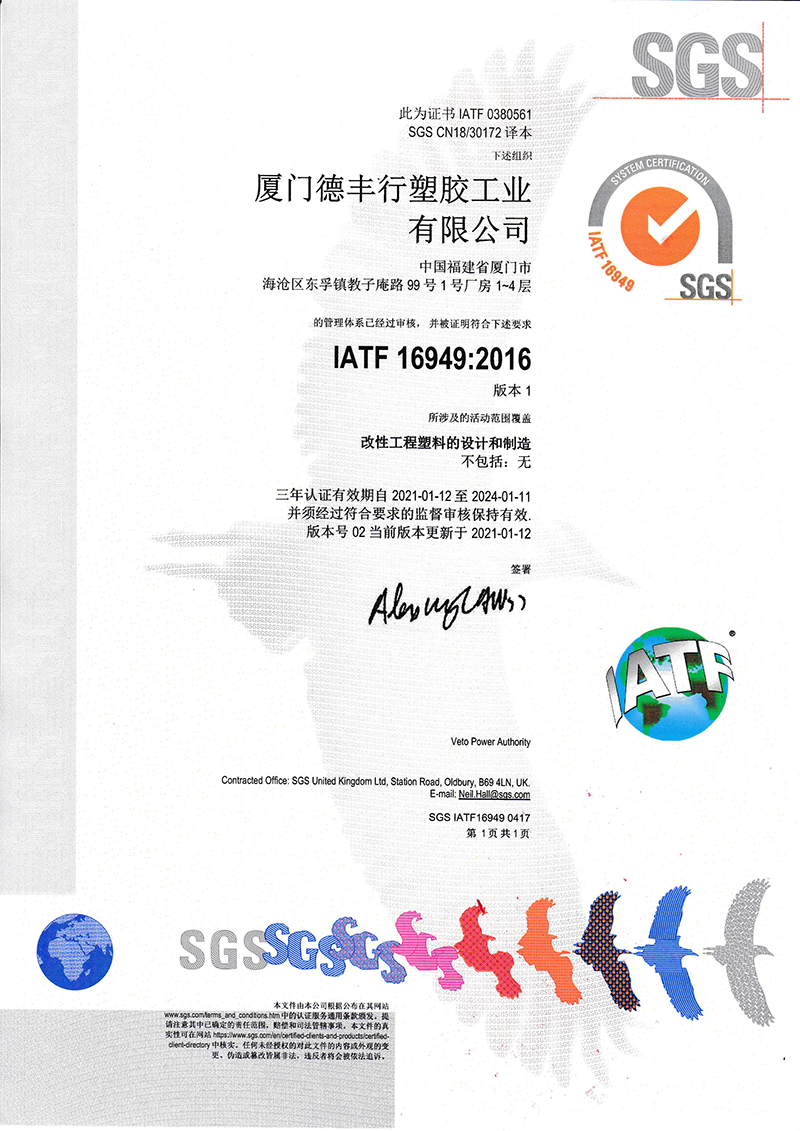 目前公司已通过ISO9001:2015、 ISO14001: 2015和IATF16949:2016质量体系认证。公司拥有PP、PA、ABS/PS/PC,PBT/PET和特种工程塑料等五大系列产品,熟练运用增强、增韧、阻燃(无卤)、合金、抗静电、耐磨、耐寒、耐候、功能母粒和降解材料等改性手段。产品广泛应用于汽车、家电、电子电气、卫浴、运动器材、电动工具、灯饰照明和通讯行业。经过多年的努力和积累,公司多项产品获得美国UL认证和SGS环保认证,并申请了多项国家发明专利。